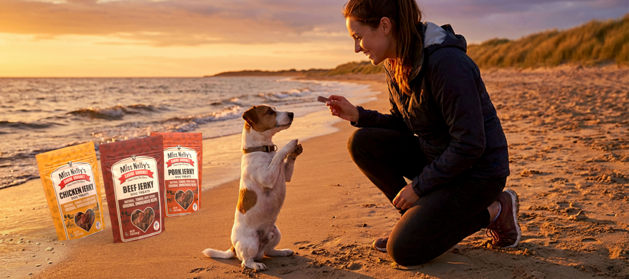 At Miss Nelly's Canine Gourmet, love and minimal processing form the heart of everything we do. Since 2012, we've been crafting dog jerky treats the right way—slow-roasting real meat for hours using time-honored methods to develop a natural wood-smoked flavor and a satisfying, chewy texture. We avoid chemical preservatives, MSG, and synthetic flavors, choosing simple, carefully selected ingredients that retain their natural goodness. The result is a clean, minimally processed treat we're proud to feed our own dogs.